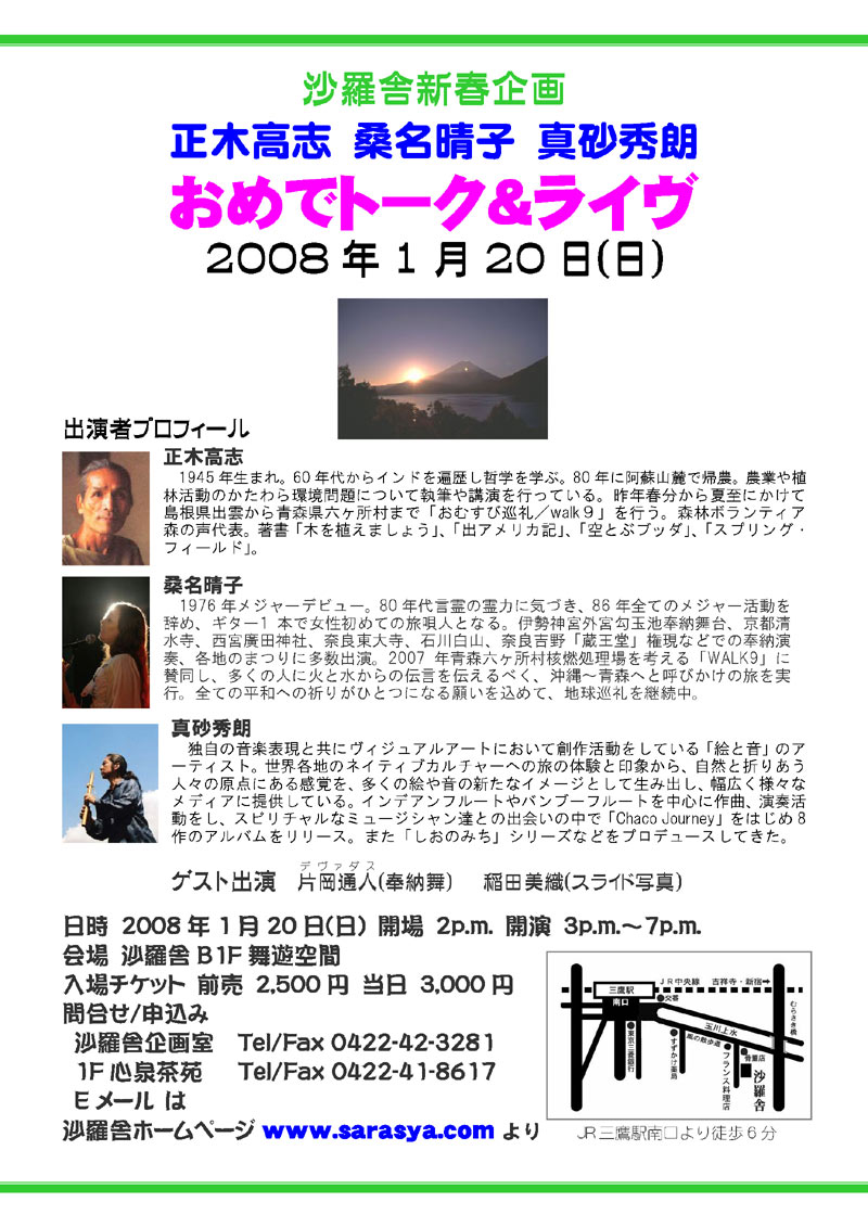 | 2008年 1/20(日) | 正木高志・桑名晴子・真砂秀朗 おめでトーク&ライヴ | |