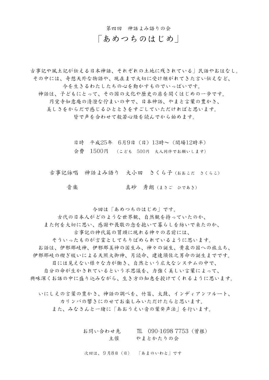 円覚寺 如意庵 (JR北鎌倉駅前) 開場 12時半 開演 13時 古事記詠唱 神話よみ語り/大小田さくら子 音楽/真砂秀朗 お問合わせ 090-1698-7753(曽根) |